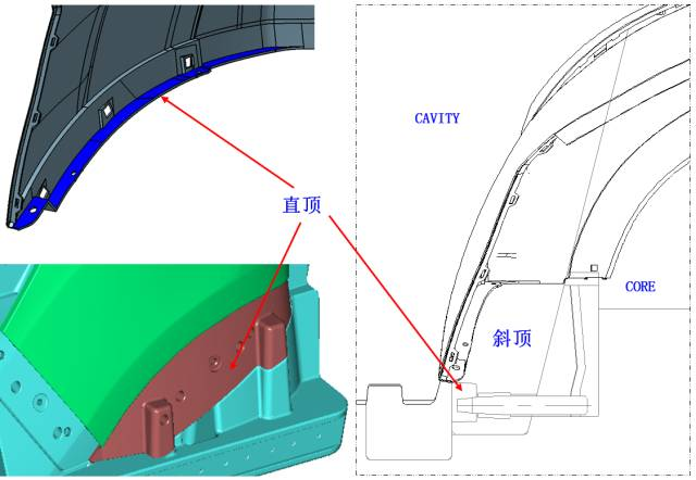 扣位采用在直頂上做隧道彈塊的結(jié)構進行脫模: