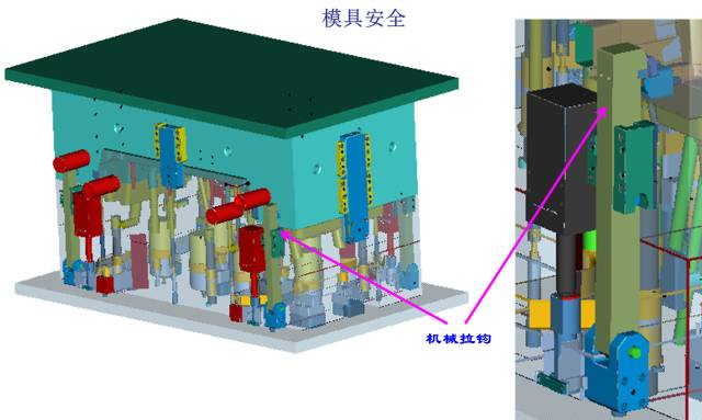 為了保證開模時斜頂跟前模一起同步運動,以使產(chǎn)品變形而脫模,當頂出機構同前模同步運動60MM后, 前/后模部分分離,這樣保護了模具,也保證了產(chǎn)品不會被拖傷!